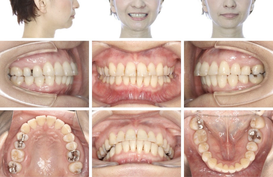 初診時、上下顎にでこぼこ(叢生)、上顎には隙間も認められました。また上下顎歯列の真ん中(正中)の不一致も認めました。10年前から顎関節症の既往があり、就寝時にはマウスピースを使用されていました。