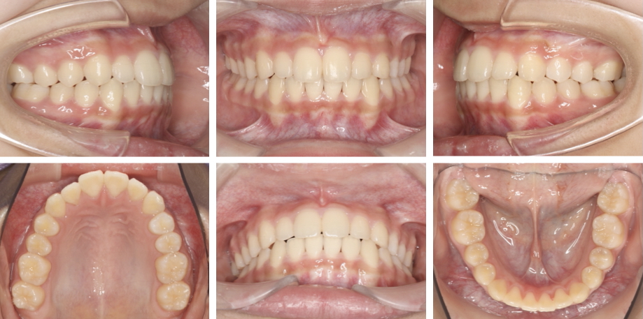 治療開始前、上下顎歯列正中の不一致を認めましたが、奥歯のかみ合わせに大きな問題がなかったことから、永久歯の抜歯は行わず治療を行いました。はじめの頃は治療になれず大変な様子でしたが、徐々に協力度もあがり最終的には非常に短期間で綺麗に治療を終えることができました。